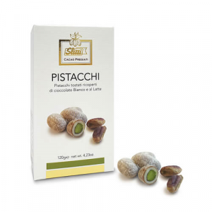 Pistacchi tostati ricoperti di cioccolato Bianco e Latte.La qualità indiscussa del Pistacchio di Bronte si unisce ad un rivestimento sottile di Cioccolato Bianco e al Latte per dare origine ad un prodotto delicato e di grande pregio.
